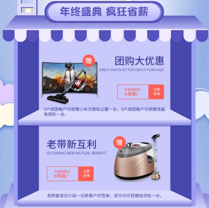 5.團購大優惠:3戶成團每戶可獲贈小米無限吸塵器一臺,5戶成團每戶可獲贈液晶電視機一臺。