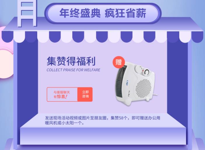 8.集贊得福利:發送現場活動視頻、圖片或活動信息至朋友圈,集贊58個,即可贈送辦公用暖風機或小太陽一個。